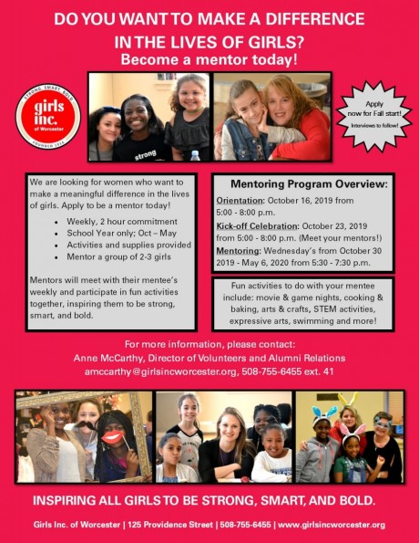 Come learn more about our mentoring program and how you can make a difference in the lives of girls. Mentoring is a weekly 2 hour commitment for the school year (October through May).